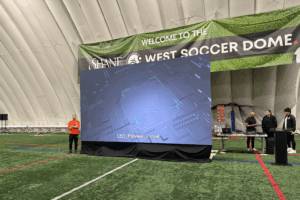 Massive outdoor-grade LED screen installed at a soccer dome, delivering clear visibility even in bright environments.