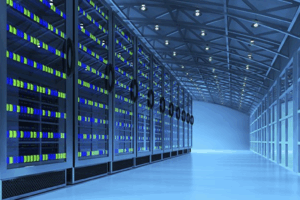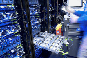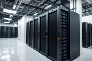 Professional setup of racks, servers, and storage systems.